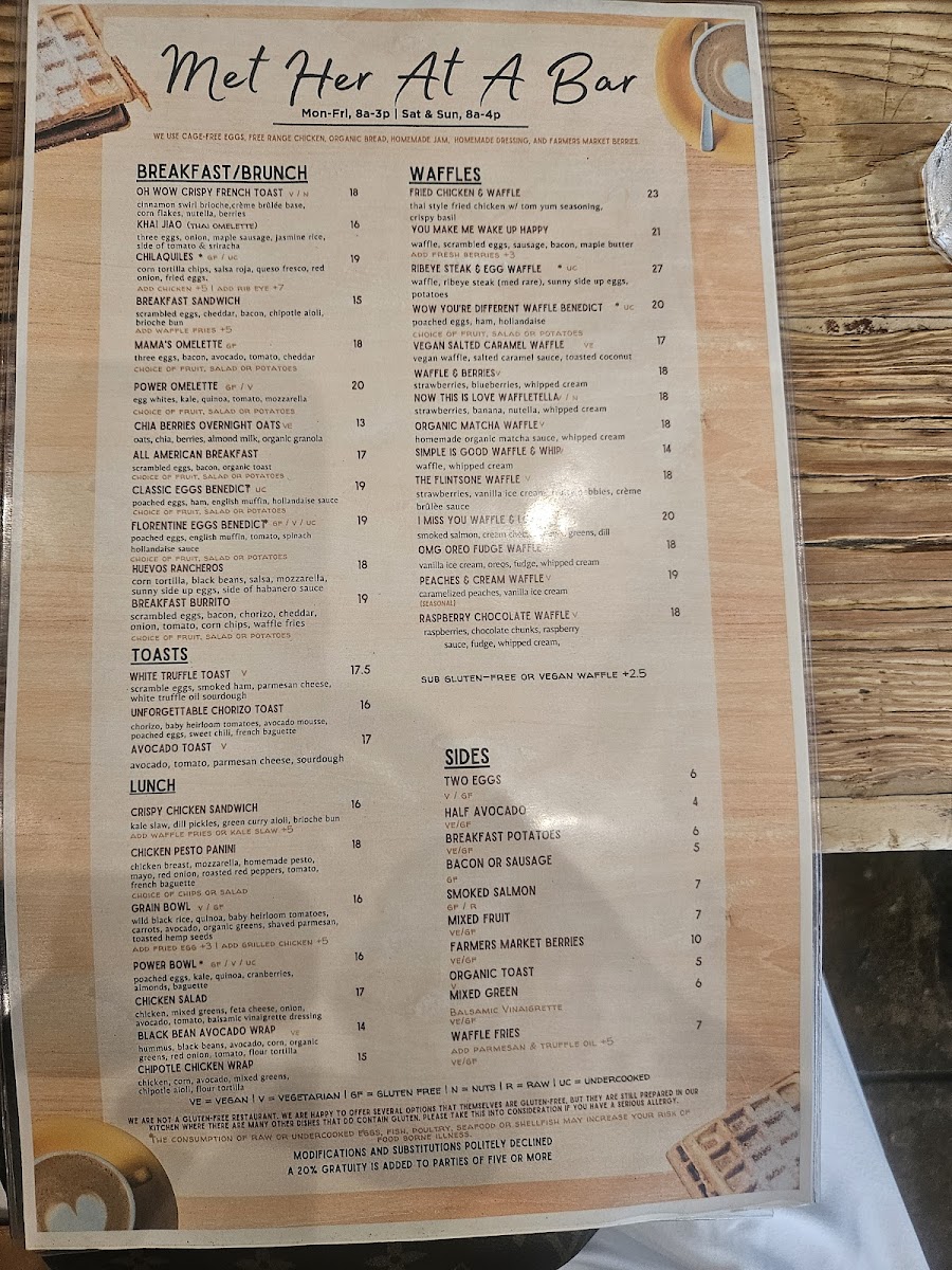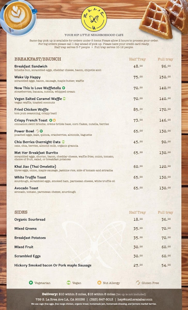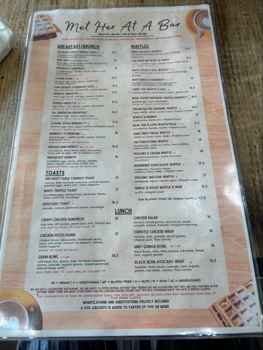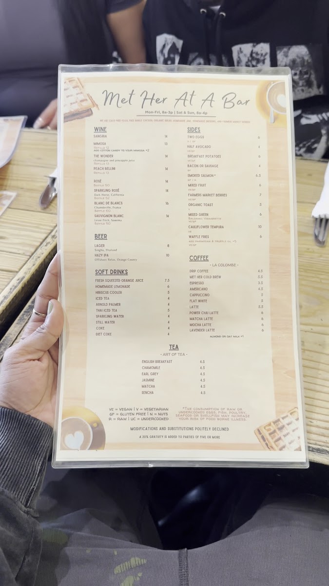 At Met Her At A Bar, you'll find a menu that pairs perfectly with the vibrant atmosphere of this Los Angeles hotspot. Located at 759 S La Brea Ave, the restaurant offers an eclectic mix of comforting classics and creative twists. Whether you're here for a laid-back dinner with friends or a fun night out, each dish is crafted with fresh ingredients and served with a side of personality. From savory appetizers to indulgent entrees, there’s something to please every palate. The cocktail menu is equally exciting, featuring expertly crafted drinks that will make your visit even more memorable. So, grab a seat, relax, and let the flavors do the talking - this is one menu you won't want to miss.